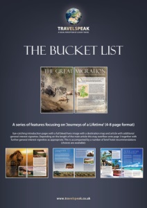 the bucket list ne of themost sought-after experiences for safari enthusiasts, the GreatMigration is the ever-moving circularmigration of over threemillion animals across theSerengeti-Mara ecosystem that straddles the border betweenKenya and Tanzania inEastAfrica. The constantmovementof columnsofwildebeest, joinedby ahostof companions like zebraalongwith topi,elandand othergazelle, followanage-old route in searchofgrazing andwater.Thismunchingmultitude sharea common appetite for thewide-opengrassesof the savannahbut curiouslyZebra tend toeat the longgrasswhilstWildebeest feaston the thenexposed young shoots. It’sallabout teamwork -1.5millionwildebeestand400,000 zebra in peaceful coexistence.Due to the sheer sizeof theherd, the animalshave tomove tobeable to survive.Theherds generally follow the rain,aswhere there is rain, there is freshgrass.Oncegrass isdepleted inonearea, theywill moveon to thenextgrassyarea. After springtime calving in the southernpartofTanzania's Serengetinear theNgorongoroConservationArea (when nearly500,000 calvesareborn), theanimals journey through theSerengetiupandaround ina clockwisedirection towards theMasaiMara inKenya,before returningonceagainnear theendof the year.Along theway,highdrama isalways present,as thousandsofanimalsare takenbypredators (lions, leopards, cheetahs,Africanwilddogs and spottedhyenas)and thousandsmoreareborn, replenishing thenumbersand sustaining the circle of life.The columnsofwildebeestare so largeand long that they canbe viewed from space. At key crossings along theMara andGrumeti rivers themigrationbecomes a desparate frenzyas the multitudes cascade intoNileCrocodile-infestedwaters. It is a battle for survivalwith theweak, wounded or isolatedanimalspreyed upon bywaiting flotillas of these large reptileswhich canweigh up to 750kgs.Theyneed toget their fair share as they survive on one or two feedings a year so the toll is impressiveafterwhich the crocs going into semi-hibernation.Meanwhile,on the subjectof predatorialappetite,a fully grownmale lion can eat up to 40kgofwildebeest in one sitting rerpesenting one quarter ofhis own bodyweight. BothKenyaandTanzaniaoffer superlativeandoften veryexclusiveaccommodationswithinand around this immense cross-borderarea.What’smore,as themigration isa year-roundaffair your choiceof specific locationwillbedeterminedby the timeof the year.Butbewarned,mostof themost exclusive, luxury tented campsanddesigner lodges tend tobookout, so itpays toplanwell in advance toguarantee your ring-side seat for thegreatest showonEarth. O A series of features focusing on ‘Journeys of a Lifetime’ (4-8 page format) Eye-catching introduction pages with a full bleed hero image with a destination map and article with additional general interest vignettes. Depending on the length of the main article this may overflow onto page 3 together with further general interest vignettes as appropriate. This is accompanied by a number of brief hotel recommendations (choices are available): Comprisedof just two intimatecampsofnine tentedsuiteseachanda family tent;eachelegant tent,with itsownprivatebutlerandhousekeeper reflects the ambianceandglamourofKenyanexplorersofold.Slip intoaworldofhardwood floors,polishedsilverandcopperbathtubs juxtaposedagainst the romanceof theopenMaraplains,with theirabundantherdsofwildlife.Beautifully handcraftedartefacts,fineantiques, leatherbuttonedChesterfieldsofas,books, andcrystalandcandlelightadorn thecomfortablesittinganddiningareas. Refreshing lappools ineachcampprovidecoolcomfort inbetweencaptivating gamedrives.Delectablecuisine isserved inamemorablesettingbeneath the starsandbushbreakfastsand romanticsundownersofferanunforgettable Africanexperience.AdventuresatBateleurCamp include twice-dailygamedrives, includingspot-litnightdrives.Thecampalsooffersa rangeofadditional activitiessuchasbushwalks,hotairballoonsafaris,communityexcursions,a well-equippedgymandwellness treatments inourmassagesala. Setonaprivateconcession,withabundant iconicwildlifeandpanoramicMasai Maraviews,KichwaTemboTentedCampdazzleswith itscontemporarysafari feel. With timeless interiors thataresimpleyetsophisticatedandstylish, theCamp enhancesguests’senseofprivacyandenjoyment.12Classic tents,20Superior tentsandeightSuperiorView tents,are laidout in immaculategrounds,with leisurelygroupsofwarthog feeding rightoutside the tentdoors.Maasai-inspired interiorsfirmlyentrench&BeyondKichwaTemboTentedCampas theunrivalled luxury tentedcampof itssize in thegreaterMara. Massivewindows in thespaciousguestareas invite theMara insideand incorporatesplit-levelspaceswhereguestscan relaxandunwind.Pickandchoose delicious ingredients from theorganicgardenandenjoyconvivialconversations in the inviting interactivekitchen.Treatyourself toholistichealing in themassage tent, indulge ina rejuvenating treatmentorbrowse theSafariShop,offering the finestKenyanhandicrafts.The rim-flowswimmingpool, literallyon theedgeof the Mara,boastsoneof theworld’smostextraordinaryviews. Beyond Beyond TANZANIA SERENGETI TheSerengetiNationalPark,meaning“endlessplains”in theMaasai language, is undoubtedlyoneof theworld’smostcelebratedwildernessareasand isanongoing sourceof inspiration towriters,filmmakersandphotographers.Theexpanseof the SerengetiNationalParkcreates theopportunity forendless roamingassafari-goers pursue theirultimatewildlifeencounters.Ballooningover theplains itself isstunning, however, it isawe-inspiring toballoonover themigrationherd toactuallygeta panoramicviewof itsenormity. Whenplanningasafari to theSerengeti it is important toconsider transfer arrangements from internationalgateways likeArusha inTanzania.Anoverland transferwillbesomewhat lengthyandwouldbenefit fromstopoversen-route, perhapsonLakeManyaraoron the rimofNgorogoroCrater,which liealong the route into theSerengeti.Most likely,youwillopt forsomeelementofsmallaircraft transfer especially ifcontemplatingastay in thewesternandnortherncorridorsof thepark. &BeyondSerengetiUnderCanvas 